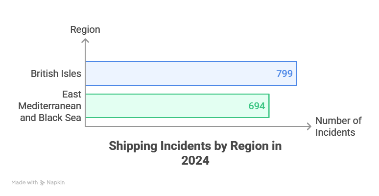 While total losses have decreased, the number of reported shipping incidents increased by approximately 10% in 2024, totaling 3,310 compared to 2,963 in 2023. The British Isles recorded the highest number of incidents (799), followed by the East Mediterranean and Black Sea (694). Over the past decade, the British Isles accounted for 20% of all reported incidents globally.